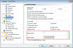 However in TortoiseSVN settings you can specify which folders you want to scan and which not. In the screen below I forced TortoiseSVN to scan only the two folders specified in the Include paths. Other folders won’t be scanned because disk C: is specified in the Exclude paths.