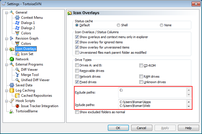 However in TortoiseSVN settings you can specify which folders you want to scan and which not. In the screen below I forced TortoiseSVN to scan only the two folders specified in the Include paths. Other folders won’t be scanned because disk C: is specified in the Exclude paths.