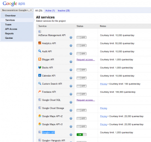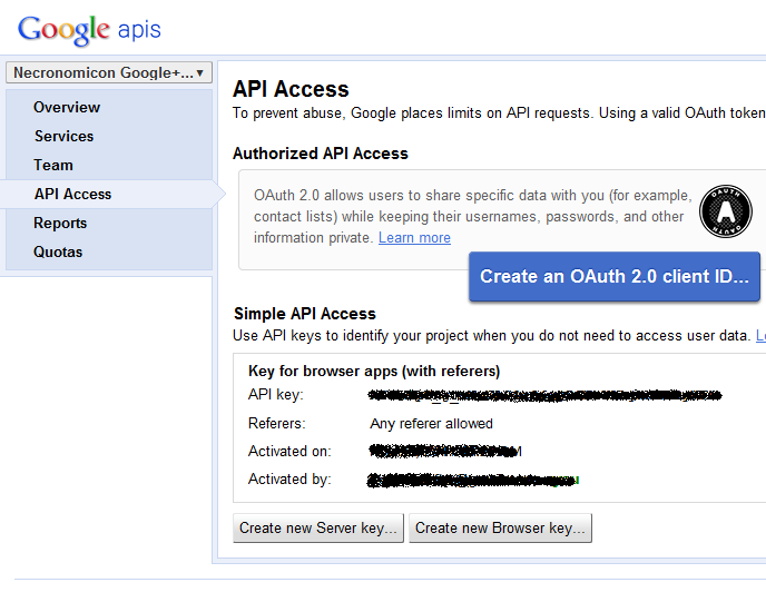 First of all you have to create new project using Google+ API. Go to Google APIs console and from the drop down on the left side of the page create new project. You can use whatever project name you want. I created this service because I wanted to access data for Necronomicon magazine, so I called the project Necronomicon Google+ RSS. After you click OK you should be redirected to API Access page and you should see you new API key there.
