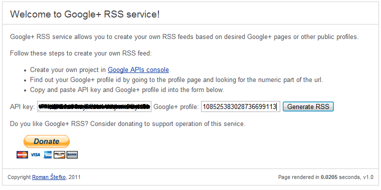 Thats it! Now you have all data you need to generate your Google+ RSS feed. Go too the Google+ RSS service and put API key and Google+ profile id there.