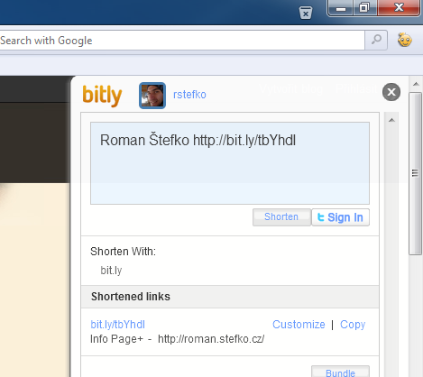 I have released new little extension for Opera, which will display bit.ly button in the top-right corner of the Opera browser window. Clicking on the button will summon bit.ly Sidebar allowing you easily shorten current page URL or even publish it directly to Twitter and much more.