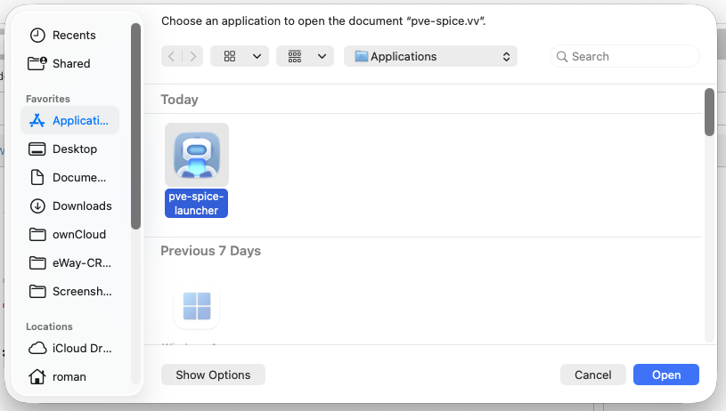 When you click Open on the pve-spice.vv you can Choose pve-spice-launcher that we created earlier.